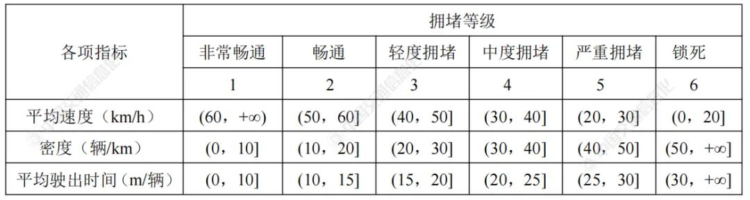 美國(guó)交通研究委員會(huì)發(fā)行的《道路通信能力手冊(cè)》[15]中將交通擁堵狀態(tài)分為六個(gè)等級(jí):1非常暢通、2暢通、3輕度擁堵、4中度擁堵、5嚴(yán)重?fù)矶隆?鎖死,數(shù)值越高表明交通擁堵情況越嚴(yán)重。結(jié)合本文具有的道路數(shù)據(jù)資源,確定3個(gè)因素指標(biāo)對(duì)應(yīng)交通擁堵狀態(tài)的取值范圍,如表2所示。